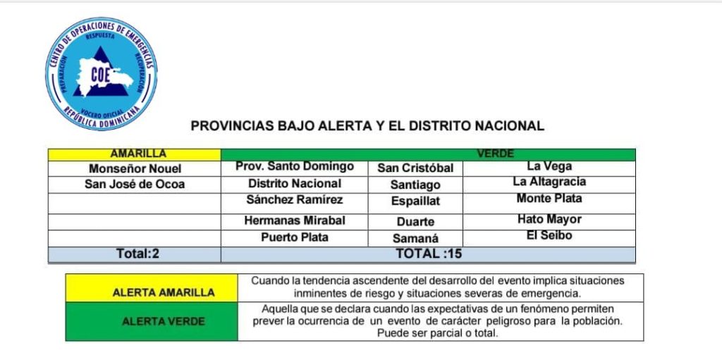 Durante su intervención, Méndez informó que la provincia Monseñor Nouel se mantiene en alerta amarilla, e igualmente San José de Ocoa en alerta amarilla, y mientras que en alerta verde permanecen Santo Domingo, Distrito Nacional, Sánchez Ramírez,Duarte, Hermanas Mirabal, San Cristóbal, Santiago, Espaillat, La Vega, Pueto Plata, La Altagracia, Hato Mayor, El Seibo ,Samana y Monte Plata.